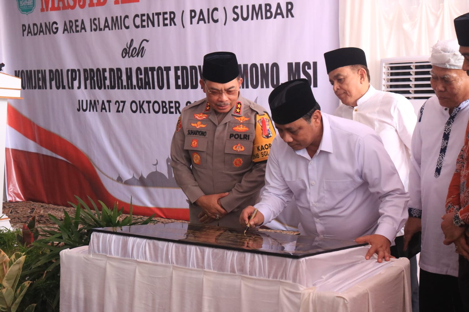 HARIANHALUAN.ID – Kapolda Sumatra Barat (Sumbar), Irjen Pol Suharyono menghadiri sekaligus mendampingi peresmian Masjid Al Hijrah di Padang Area Islamic Center (PAIC), Jalan Sisingamangaraja, Kecamatan Padang Timur, Padang, Jumat (27/10/2023).