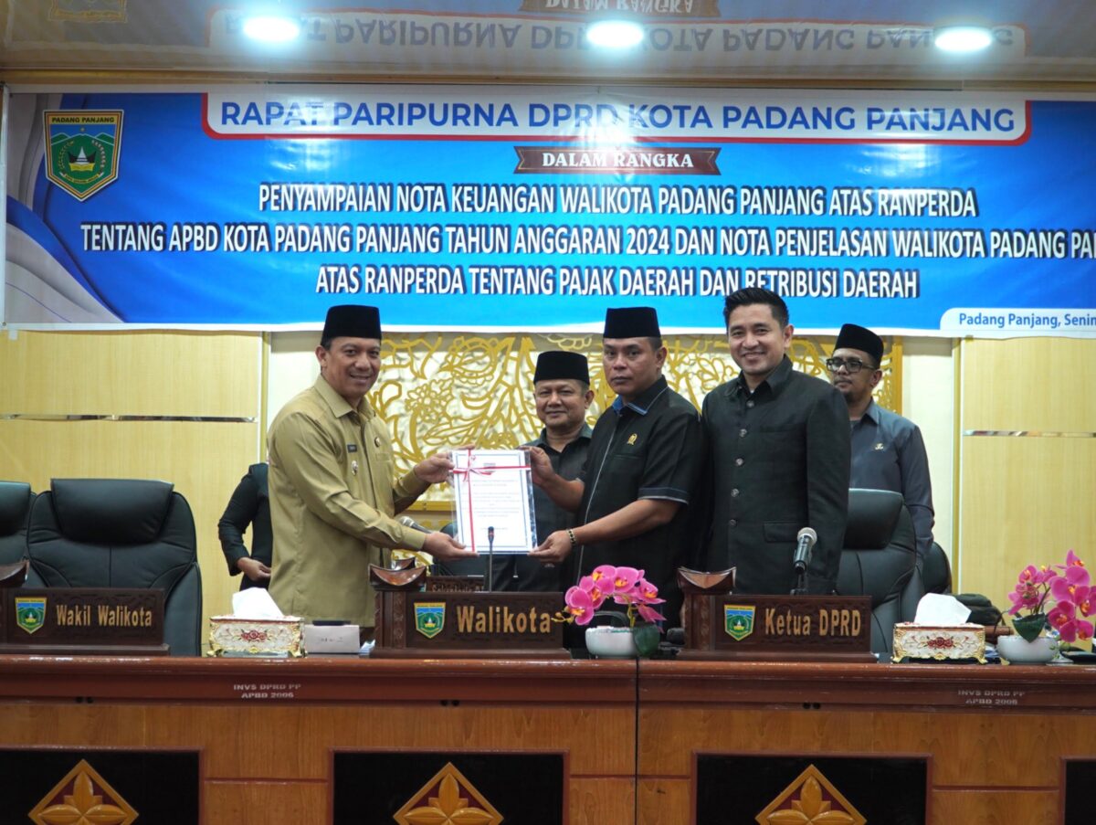 PJ Wali Kota Padang Panjang, Sonny Budaya Putra menyerahkan Ranperda APBD 2024 kepada Ketua DPRD Kota Padang Panjang, Mardiansyah. APIZRAJOALAM