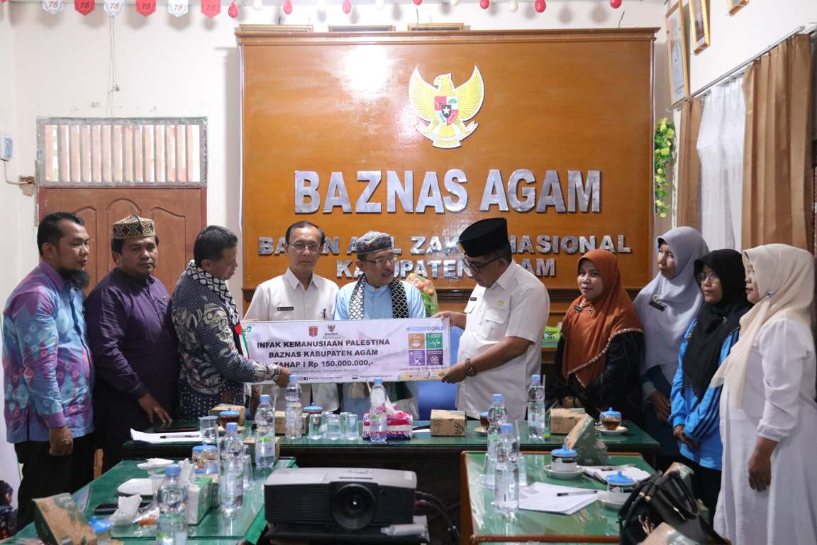 AGAM, HARIANHALUAN.ID – Badan Amil Zakat Nasional (Baznas) Kabupaten Agam menyalurkan bantuan kemanusiaan tahap pertama Rp150 juta bagi warga Palestina.