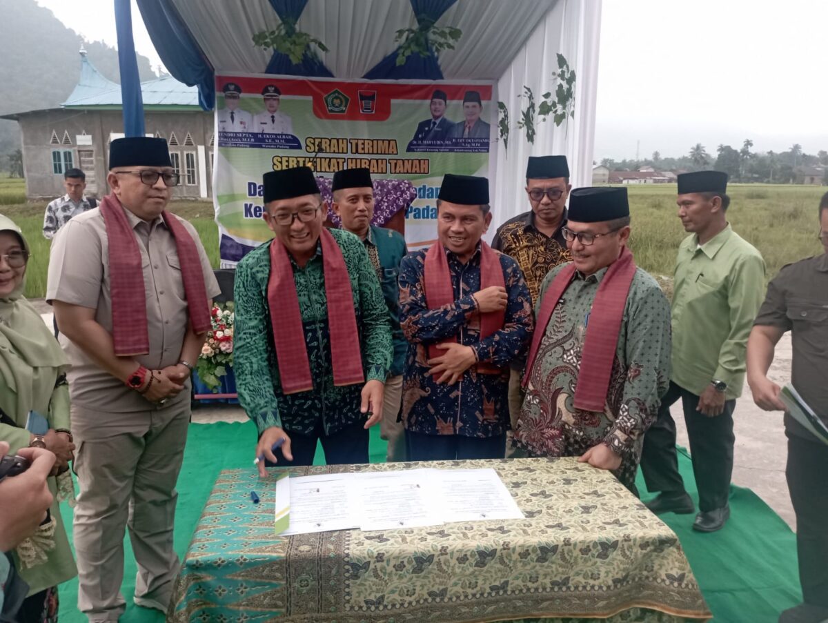 Kakanwil Kemenag Sumbar Mahyudin dalam sambutannya menyampaikan terima kasih atas penyerahan tanah tersebut. Semoga menjadi amal saleh dan tentunya bisa ada lagi hibah tanah untuk pembangunan sarana dan prasarana keagamaan.