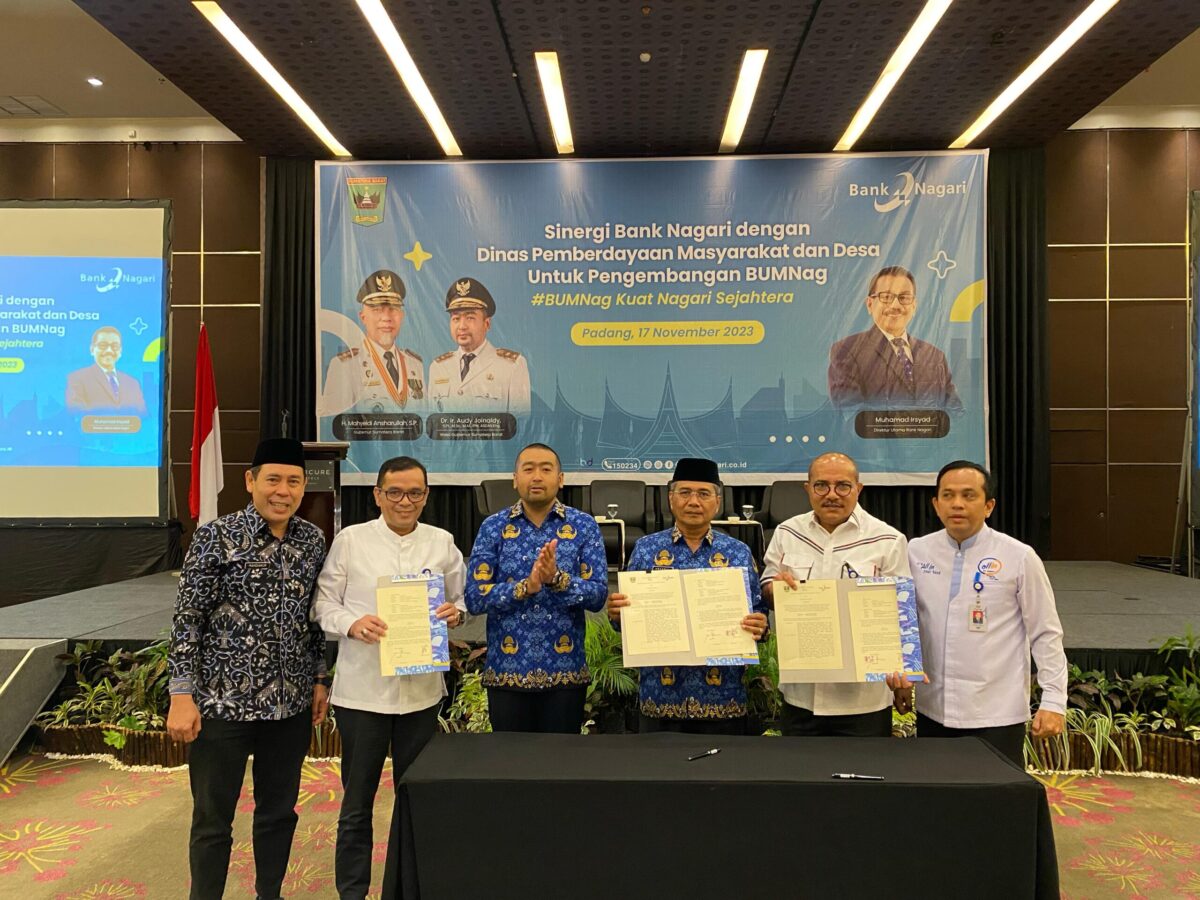 Untuk mendorong penguatan BUMNag, Bank Nagari melakukan penandatanganan Perjanjian Kerja Sama (PKS) dengan Pemprov Sumbar melalui Dinas Pemberdayaan Masyarakat dan Desa (PMD) Sumbar, Jumat (17/11) di Hotel Mercure Padang.