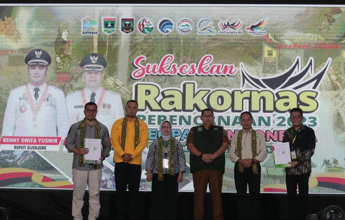 Kepala Bappeda Sumbar Medi Iswadi ST,MM didampingi Deputi Bidang kemaritiman dan Sumberdaya Alam Bappenas RI Dr.Vivi Yutaswati M.Sc,Bupati Sijunjung Benny Dwifa Yuswir SSTP,M.Si, Wabup H.Iradatillah, PJ Walikota Sawahlunto DR.Zefnihan AP,M.Si saat membuka Rakornas Geopark Perencanaan 2023, Senin (20/11) di Gedung Pancasila Muaro Sijunjung.