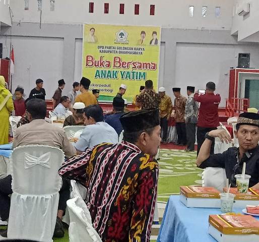 Pada kesempatan buka bersama anak yatim itu, Ketua DPD Golkar, Dharmasraya Adi Gunawan menyerahkan santunan untuk anak yatim. (*)
