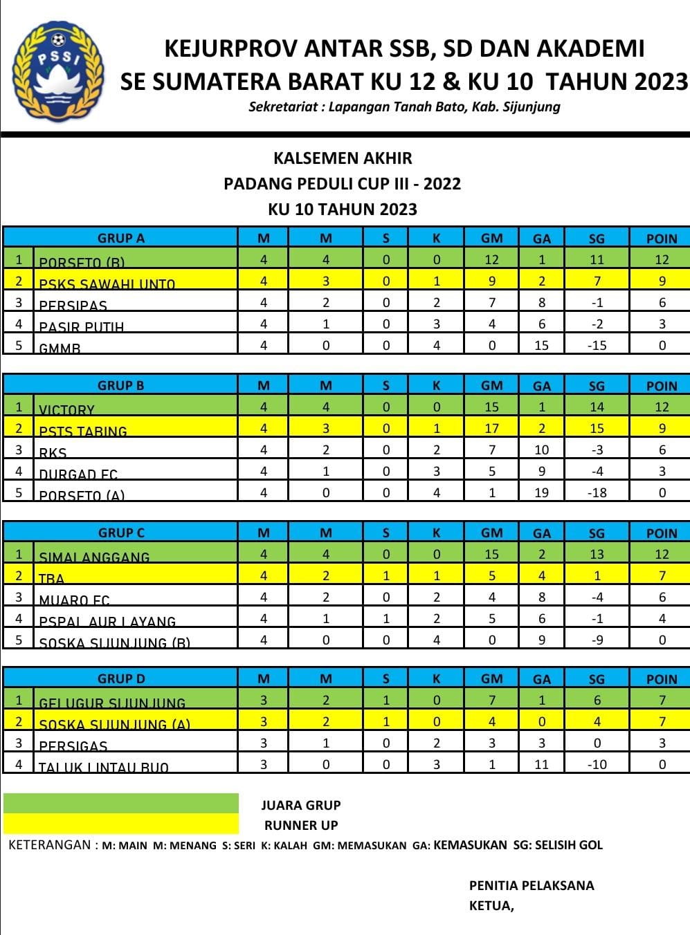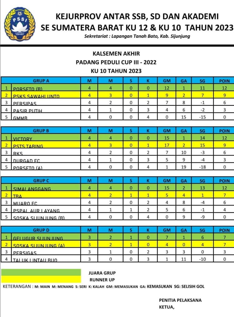 Fuadi menjelaskan, empat tim yang lolos dengan status juara grup pada babak penyisihan Kejurprov U-10 kali ini, diantaranya adalah kesebelasan Porseto B, Victory, Simalanggang dan Gelugur Sijunjung.