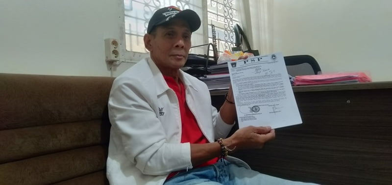 Tersangka Agus Suardi didampingi kuasa hukumnya Putri Deyesi menunjukkan surat pengusulan dana hibah dari Ketua Umum PSP Padang ke Wali Kota Padang pada Tahun 2017 kepada sejumlah wartawan, Senin (25/4/2022).