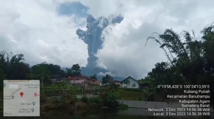 Berdasarkan video beredar yang diambil warga dari sekitar kawasan Batagak, Sungaipua, atau sekitarnya. Asap hitam abu terlihat membumbung tinggi terlihat dari kepundan puncak gunung Marapi.