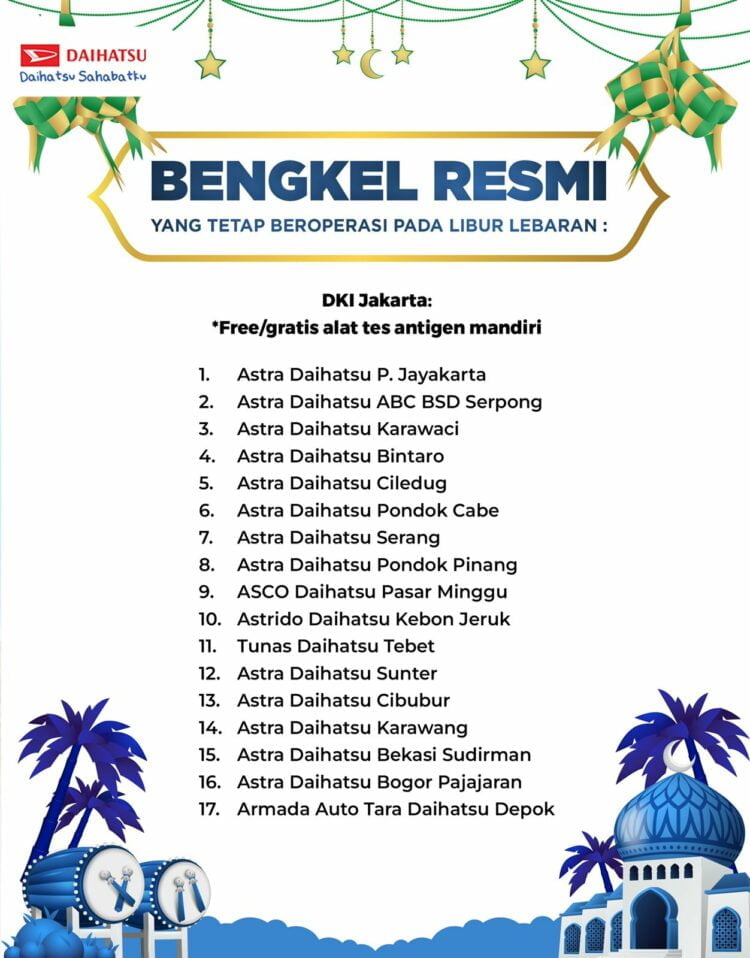 Libur Lebaran Hari Raya Idul Fitri 1443 H kali ini sedikit berbeda, setelah 2-tahun pandemi pembatasan mobilitas, tahun ini aktivitas mudik akan menyemarakkan kembali libur lebaran. Bagi para pemudik yang menggunakan fasilitas kendaraan pribadi, khususnya mobil Daihatsu, agar tetap ‘peace of mind’ selama aktivitas mudik, telah disiapkan 65 Bengkel Siaga Daihatsu.