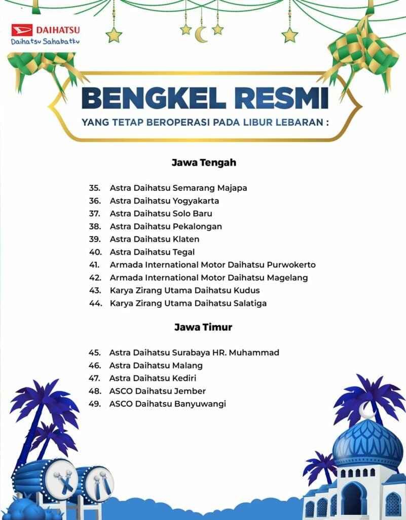 HALUANNEWS, JAKARTA – Tersebar di seluruh Indonesia, 65 Bengkel Siaga Daihatsu siap melayani pelanggan selama periode Lebaran mulai 28 April – 8 Mei 2022, yang buka setiap hari dengan jam operasional 08:00-16:00, termasuk hari libur Sabtu, dan Minggu.