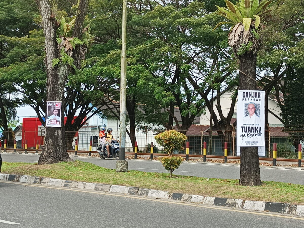 Selain ketiga Caleg DPRD Sumbar dari Partai Golkar, PSI dan Gerindra itu, puluhan baliho berlatar putih bergambar wajah Calon Presiden Ganjar Pranowo, juga ditemukan terpaku ke pohon peneduh yang ada di sepanjang jalan Adinegoro hingga Jalan Hamka.