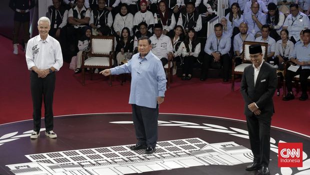 Capres nomor urut 3 Ganjar Pranowo mulanya menyalami dan berpelukan dengan capres nomor urut 2 Prabowo Subianto. Kemudian Ganjar menyalami dan berpeluang dengan capres nomor urut 1 Anies Baswedan.