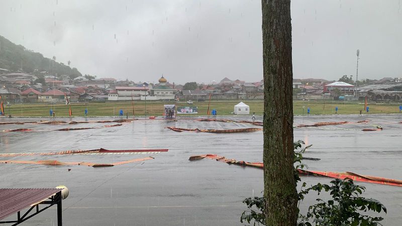 HALUANNEWS, PADANG PANJANG — Ratusan masyarakat yang telah mendatangi Lapangan GOR Chatib Sulaiman berhamburan setelah datangnya hujan, Senin (2/5/2022) pagi.