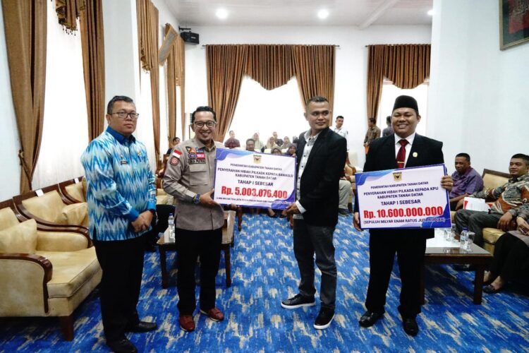 BATUSANGKAR, HARIANHALUAN.ID – Pemerintah Kabupaten Tanah Datar serahkan dana hibah Pilkada serentak tahun 2024. Bantuan hibah tersebut diserahkan langsung oleh Bupati Tanah Datar Eka Putra, SE,MM kepada Ketua KPU Tanah Datar Dicky Andrika dan Ketua Bawaslu Tanah Datar Andre Azki, Kamis, (28/12/2023) di gedung Indojolito Batusangkar.