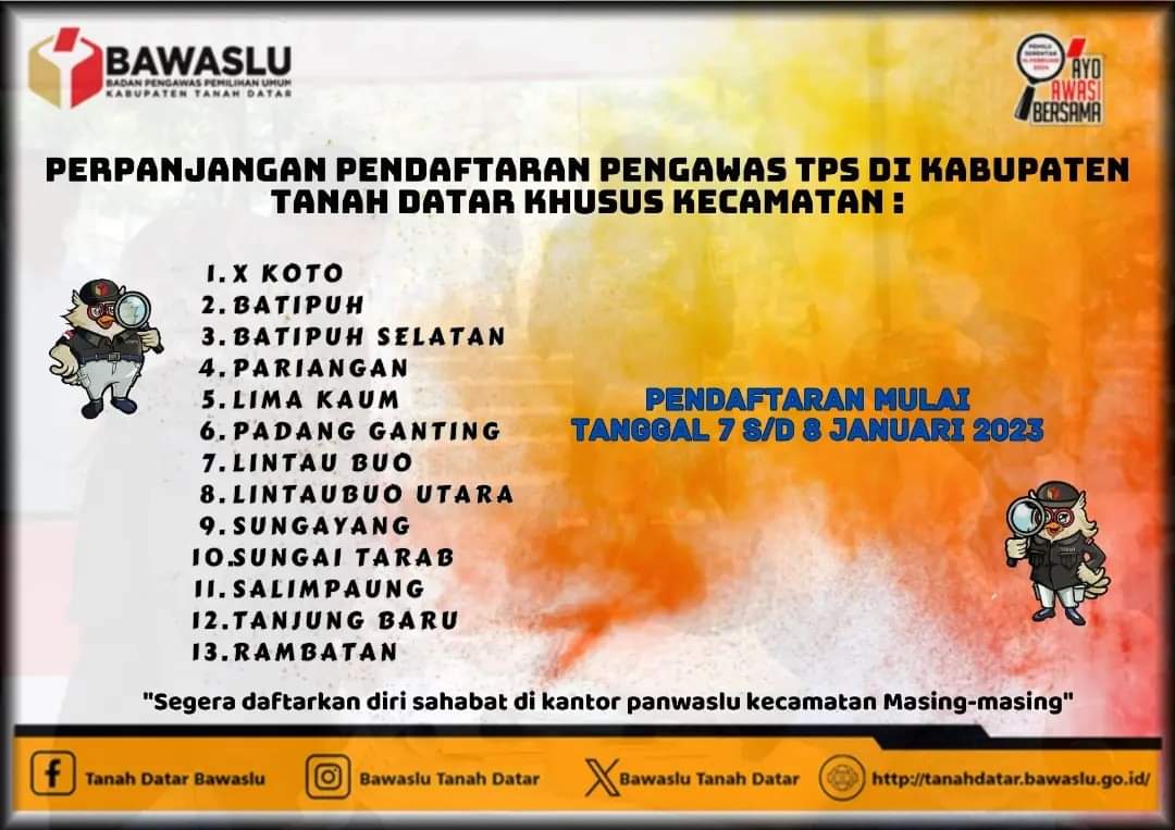 TANAH DATAR, HARIANHALUAN.ID – Bawaslu Tanah Datar melakukan perpanjangan masa pendaftaran bagi masyarakat yang berminat menjadi pengawas TPS (PTPS) untuk 228 TPS dari 1.228 total TPS se Tanah Datarmulai tanggal 7-8 Januari 2024 mendatang.