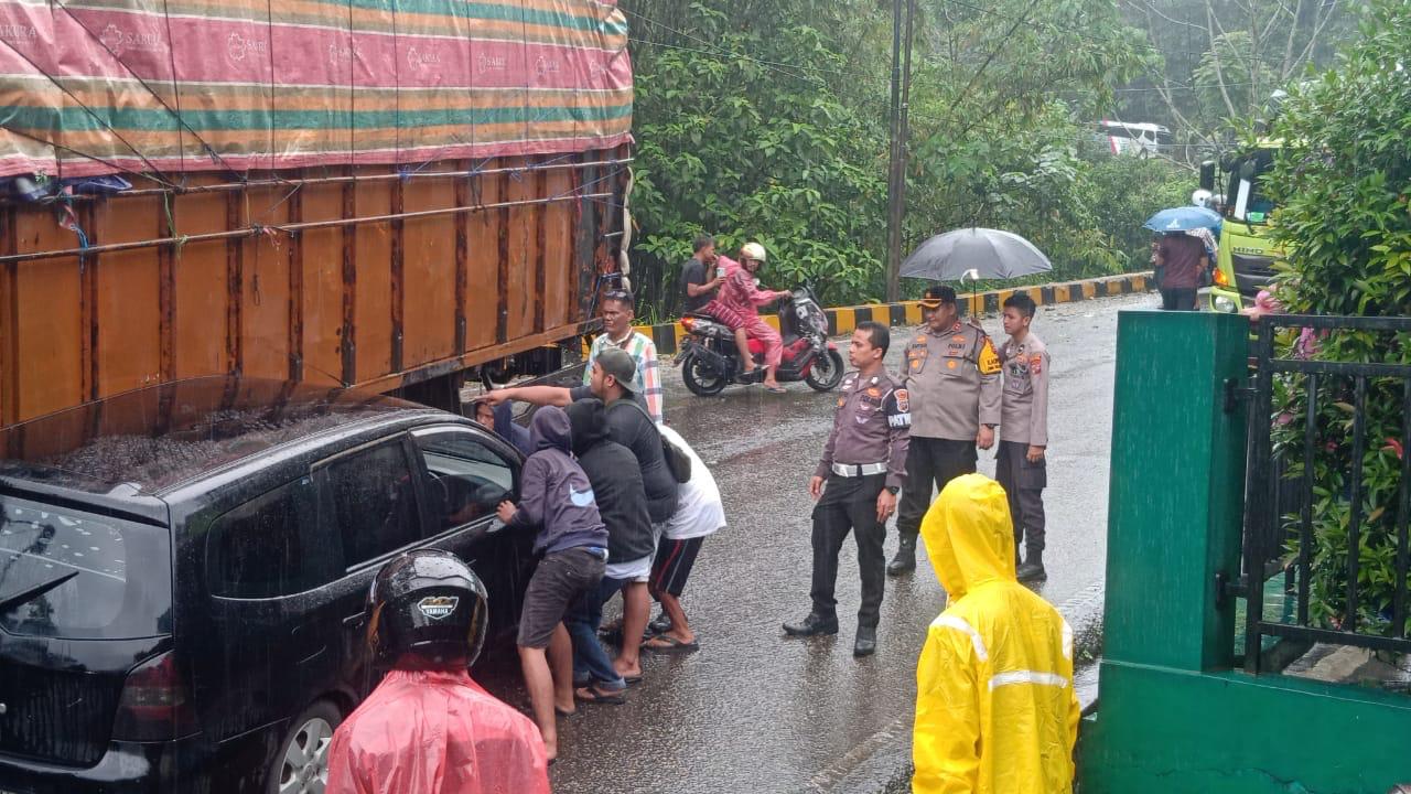 Pantauan di lapangan, satu unit truk dari arah Padang Panjang menuju Padang tampak hilang kendali san menabrak minibus Merk Grand Livina, Sigra dan Grand Max yang tepat berada didepannya.