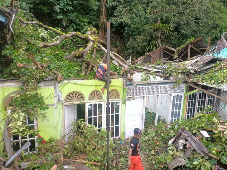 Pohon dengan ukuran cukup besar itu menimpa empat rumah yang didiami oleh empat Kepala Keluarga (KK), yakninya Firdaus (38), Masfar (72), Bernal (60), serta Nafrianto (42).