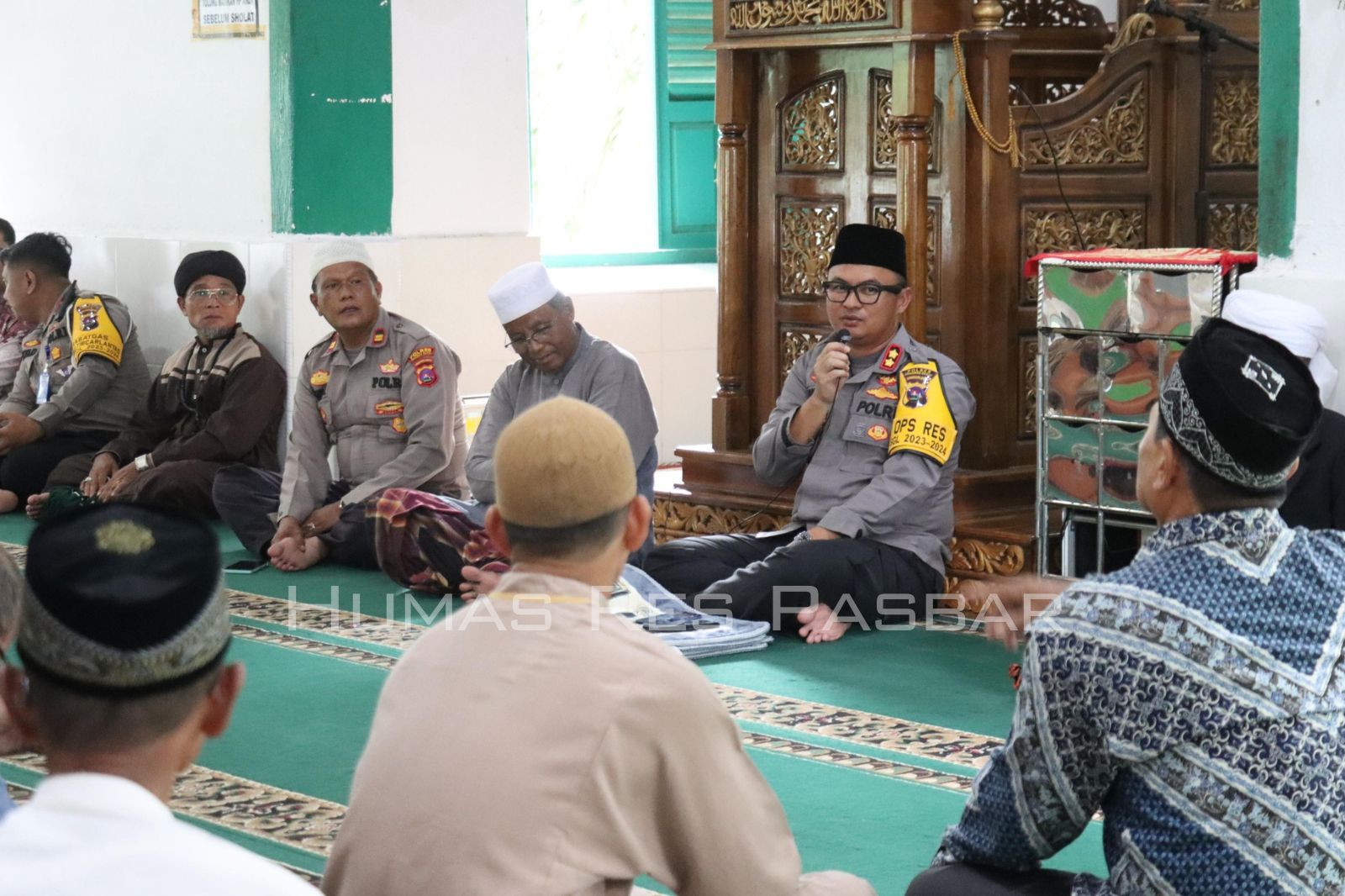 PASBAR, HARIANHALUAN.ID – Kapolres Pasaman Barat, AKBP Nurhadiansyah bersama pejabat utama menyapa jemaah Masjid Raya Muaro Kiawai yang berada di Jorong Sudirman, Nagari Muaro Kiawai, Kecamatan Gunung Tuleh, Kabupaten Pasaman Barat, saat program Jumat Curhat, Jumat (19/1/2024) siang.