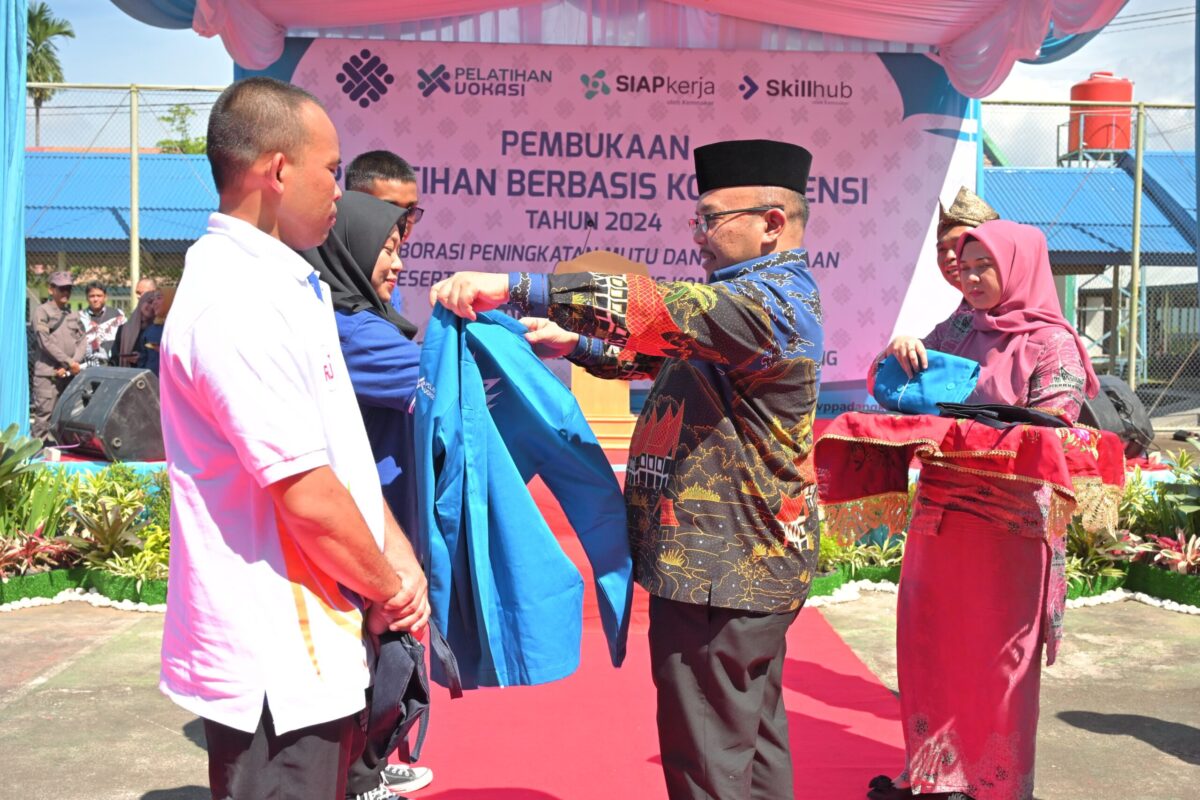 Sekdaprov Sumbar, Hansastri memasangkan jaket kepada perwakilan peserta Pelatihan Berbasis Kompetensi Tahun 2024 di Balai Pelatihan Vokasi dan Produktivitas (BPVP) Padang, Kamis (25/1). IST