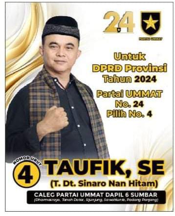 TANAH DATAR, HARIANHALUAN.ID – Taufik Dt Sinaro Nan Hitam merupakan putra daerah Tanah Datar sekaligus perantau di Dharmasraya, memiliki tekad yang bulat untuk kemajuan infrastuktur jalan dan pendidikan di daerahnya dengan memilih mengabdi sebagai calon anggota legislatif DPRD Provinsi Sumatra Barat dari Partai UMMAT.