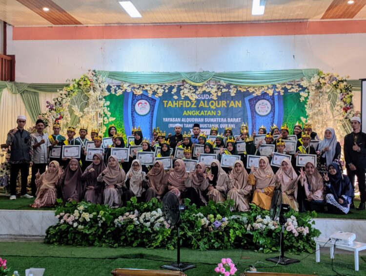 PADANG, HARIANHALUAN.ID – Yayasan Al Qudwah Sumatra Barat Rumah Tahfiz Bustanul Quran menggelar acara wisuda tahfiz angkatan ke-3. Wisuda tersebut diikuti puluhan santri dengan harapan terciptanya generasi yang mampu melanjutkan estafet kepemimpinan yang Qur’ani dan berakhlak mulia.