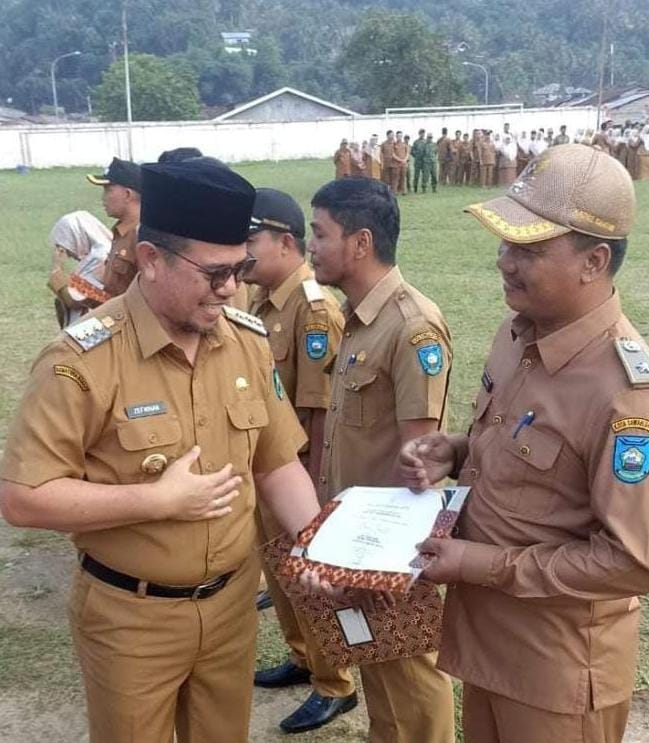 Prosesi penyerahannya bersama tersebut saat apel kesiapsiagaan pemerintah desa se-Kota Sawahlunto beserta linmas