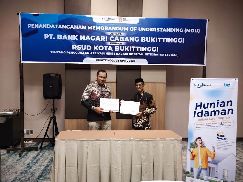 “Alhamdulillah pada Kamis (28/4/2022), Bank Nagari melakukan penandatanganan MoU dengan RSUD tentang penggunaan aplikasi NHIS. Aplikasi ini akan memudahkan pengelola RSUD dalam optimalisasi manajerial keuangan. Untuk percepatan penggunaan aplikasi tersebut, maka dilaksanan MoU antara PT Bank Nagari dengan RSUD Bukittinggi,” ujar Robby Novaldi, Senin (9/5/2022).