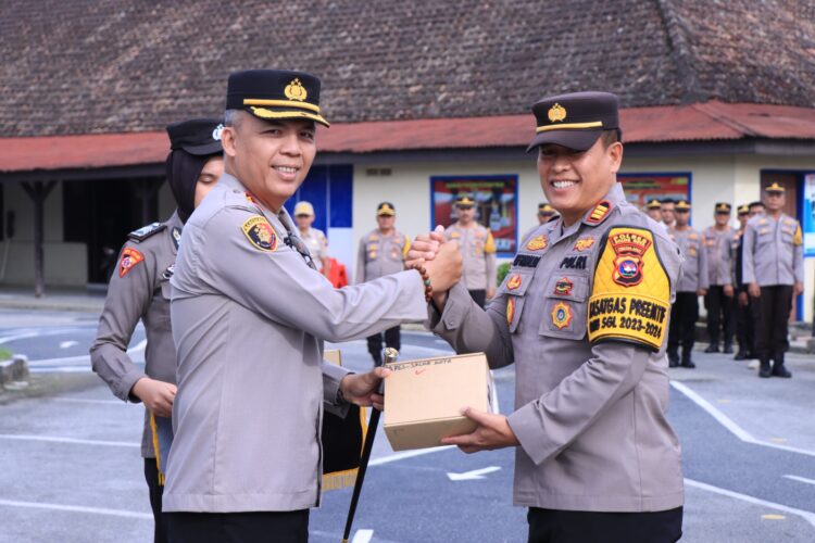 Kapolres Solok Kota AKBP Ahmad Fadilan lakukan penyerahkan Alat Komunikasi (Alsus) kepada Bhabinkamtibmas, yang diserahkan kepada Kasat Binmas Polres Solok Kota, Selasa (6/2/2024).