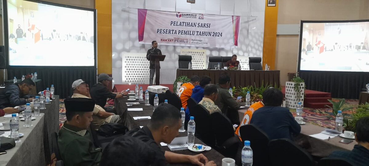 BUKITTINGGI, HARIANHALUAN.ID – Badan Pengawas Pemilu (Bawaslu) Kabupaten Agam mengelar pelatihan saksi peserta Pemilu di Hotel Rocky, Rabu (7/2/2024).