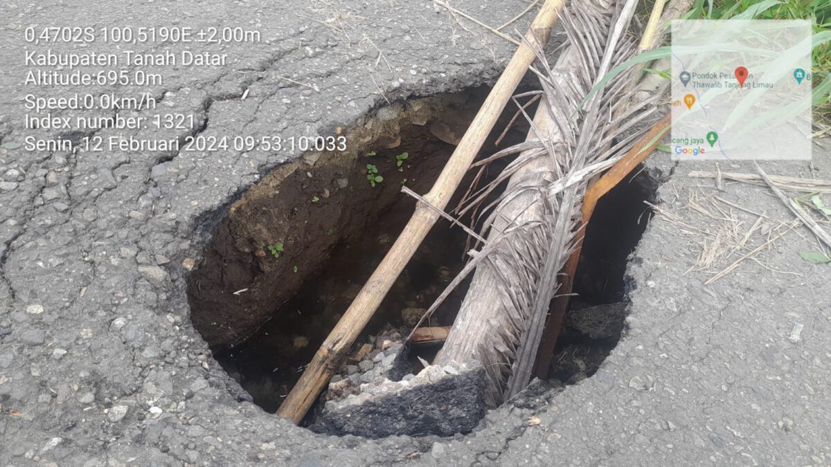 Menurut informasi diterima Haluan jalan tersebut sudah mengalami kerusakan selama dua bulan lebih akibat ambruknya aspal disana sehingga menimbulkan sebuah lubang dengan kedalaman lebih kurang dua meter disisi kiri jalan tersebut.