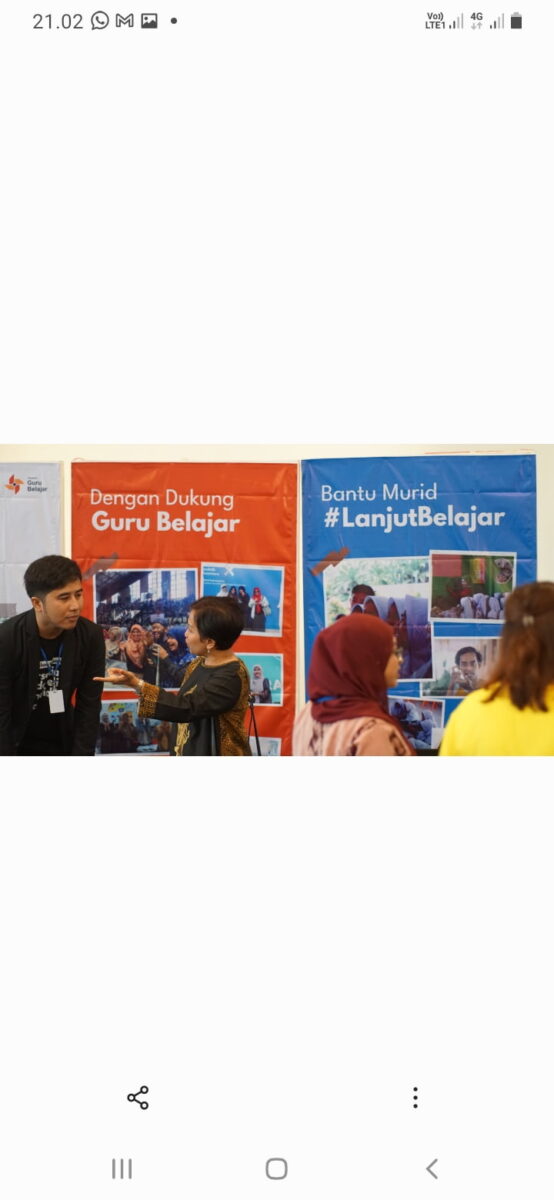 Teks Foto : Pengunjung menghampiri booth Sahabat Guru Belajar, kampanye di TPN XI untuk membantu guru dan murid #LanjutBelajar. IST