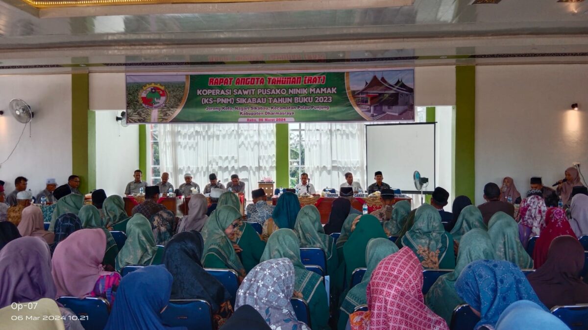 DHARMASRAYA, HARIANHALUAN.ID- Menjelang Bulan Suci Ramadhan, Koperasi Sawit Pusako Ninik Mamak (KS-PNM) Nagari Sikabau adakan Rapat Anggota Tahunan (RAT) Dharmasraya tahun buku 2023, di aula kantor koperasi sawit pusako niniak mamak, Selasa (6/3/2024).