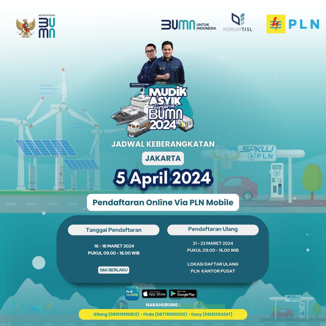 HARIANHALUAN.ID – PT PLN (Persero) bekerja sama dengan Kementerian Badan Usaha Milik Negara (BUMN) membuka program ‘Mudik Asyik Bersama BUMN’ yang pendaftarannya dibuka mulai tanggal 16 Maret 2024.