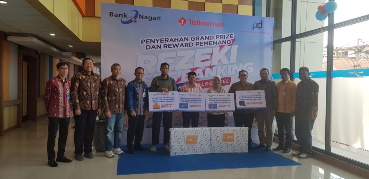 PADANG, HARIANHALUAN.ID– Bank Nagari dan Telkomsel menyerahkan hadiah Grandprize Rezeki SMS Banking Telkomsel kepada empat nasabah Bank Nagari Cabang Utama, Kamis (21/3).