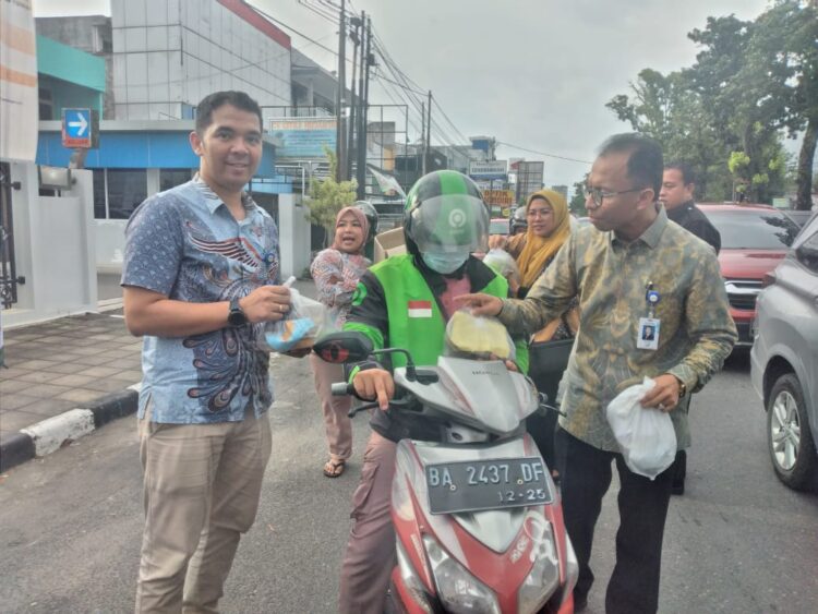PADANG, HARIANHALUAN.ID — Bank Nagari Cabang Utama Padang membagikan 1000 paket takjil kepada para pengendara dan pengguna jalan di depan kantor bank tersebut, Jl Pemuda no. 21 Padang pada Kamis (28/3).