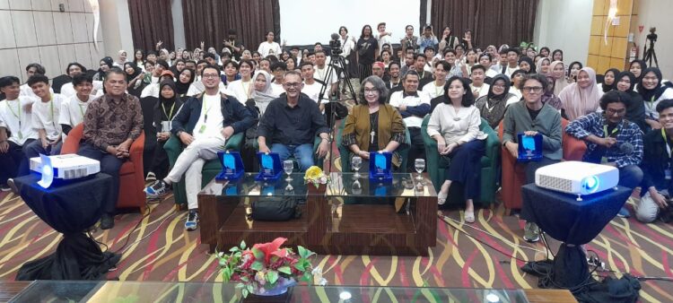 Teks Foto. Riri Reza sutradara film nasional, Hasril Chaniago sejarawan dan penulis, anak Usmar Ismail Heidy Usmar foto bersama dengan peserta pada acara Hari Film Nasional, Putar Film Usmar di Kota Kelahiran di Rocky Hotel, Kamis (28/3). YURSIL.