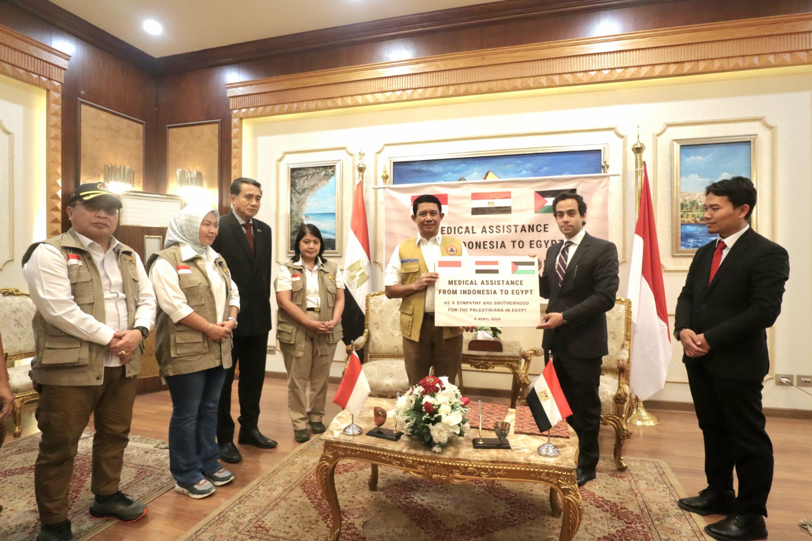 Acara penandatanganan berita acara serah terima bantuan kemanusiaan dilakukan di ruang VIP Bandara Internasional Kairo, antara Kepala Biro Hukum dan Kerjasama BNPB, Irma Dewi Rismayati, dengan Associate Minister for International Relations of Ministry of Health and Population Dr. Hatem F. Amer, disaksikan jajaran Pemerintah Kairo, delegasi dari Indonesia lainnya yang meliputi Anggota Komisi VIII DPR RI, Plt. Deputi bidang Koordinasi Pemerataan Pembangunan Wilayah dan Penanggulangan Bencana Kemenko PMK, Kepala Biro Keuangan BNPB, Widyaiswara BNPB, perwakilan Kemenlu, Kepala Pusat Krisis Kemenkes RI, dan KBRI Kairo.