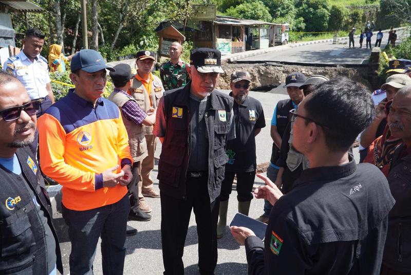PADANG PANJANG, HARIANHALUAN.ID – Gubernur Sumatra Barat, Mahyeldi meninjau lokasi jembatan dimana jalan terban yang menghubungkan Kelurahan Guguk Malintang ke Kelurahan Ganting, atau jalan menuju ke RSUD Kota Padang Panjang yang terjadi, Selasa (9/4/2024) malam.