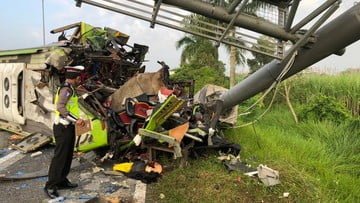Sebuah bus yang melaju di KM 712+400 jalur A Tol Surabaya-Mojokerto tiba-tiba oleng dan menabrak tiang VMS (Variable Message Sign) di pinggir jalan.