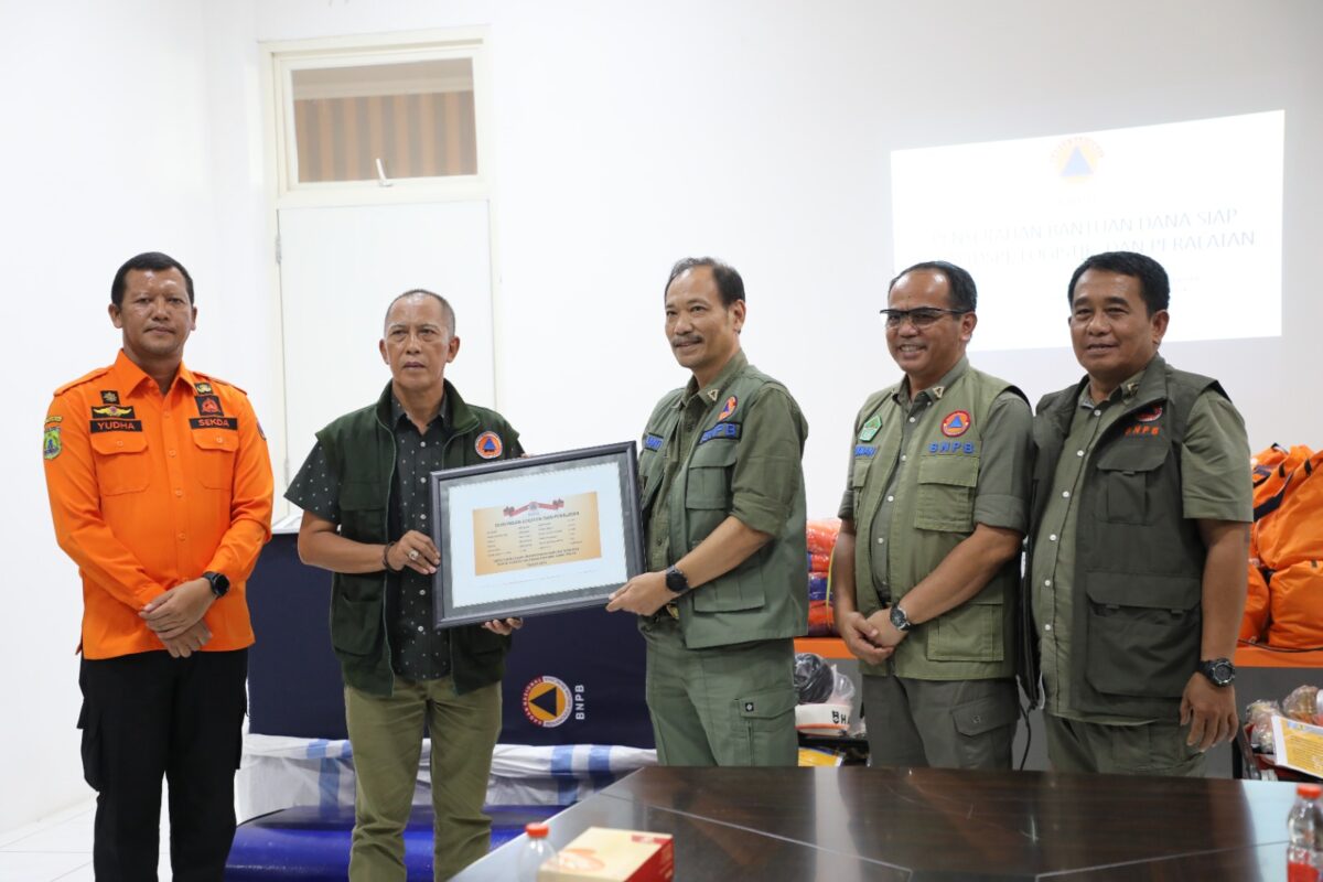 Teks foto: Pemberian simbolis bantuan dukungan penanganan darurat oleh Deputi Bidang Penanganan Darurat BNPB Mayjen TNI Fajar Setyawan dan Inspektur Utama BNPB Yulianto kepada perwakilan pemerintah daerah terdampak banjir di BPBD Kabupaten Pasuruan, Jawa Timur pada Jumat (12/4). IST