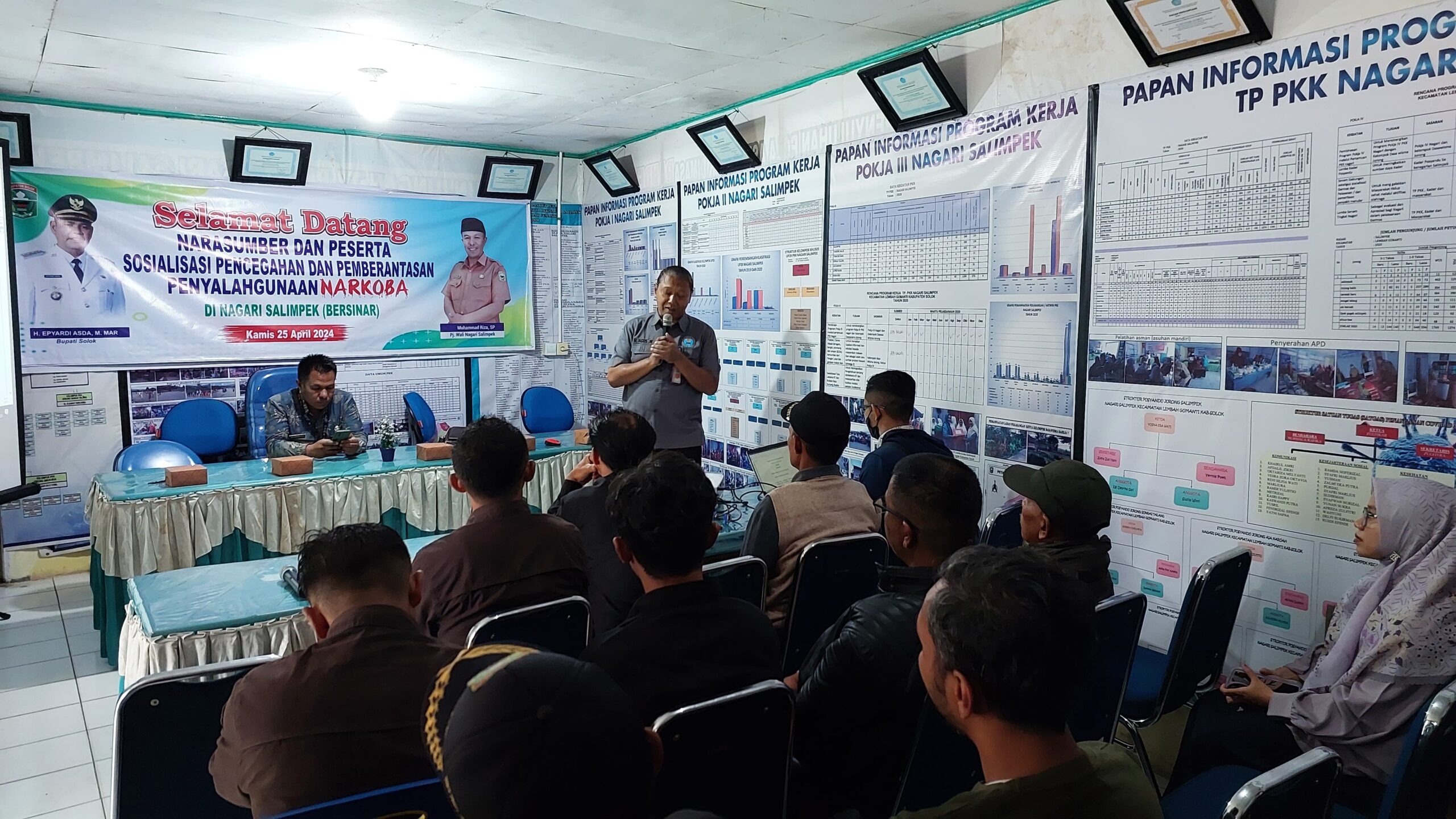 SOLOK, HARIANHALUAN.ID — Bertempat di Aula Kantor Wali Nagari Salimpek, Pemerintah Nagari Salimpek, Kabupaten Solok, menggelar sosialisasi pencegahan dan pemberantasan penyalahgunaan narkoba atau bersinar (bersih narkoba), Kamis (25/4).