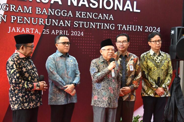 HARIANHALUAN.ID – Wakil Presiden (Wapres) RI, Ma’ruf Amin memberikan keynote speech pada Rapat Kerja Nasional Program Pembangunan Keluarga, Kependudukan, Keluarga Berencana (Bangga Kencana) dan Percepatan Penurunan Stunting, di Auditorium BKKBN, Jakarta, Kamis (25/4/2024).