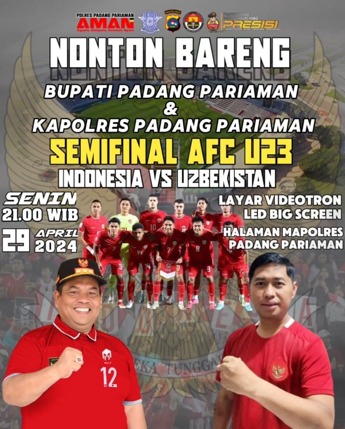 PADANG PARIAMAN, HARIANHALUAN.ID – Bupati dan Kapolres Padang Pariaman Provinsi Sumatra Barat (Sumbar) akan menggelar iven nonton bareng (nobar) laga semifinal Asian Football Confederation (AFC) U23 Asian Cup 2024 antara Indonesia vs Uzbekistan, Senin (29/4/2024) pukul 21.00 WIB.