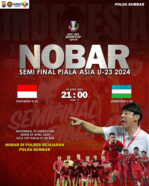 PADANG, HARIANHALUAN.ID – Polda Sumbar beserta Polres jajaran bakal menggelar Nonton Bareng (Nobar) partai Semifinal AFC U-23 Asian Cup 2024 yang mempertemukan Timnas Indonesia U23 menghadapi Uzbekistan pada Senin malam (29/4).