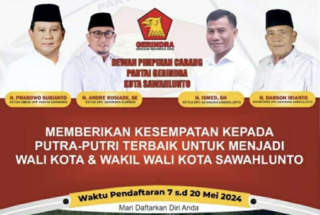 SAWAHLUNTO, HARIANHALUAN.ID- Jelang pesta demokrasi Pemilihan Kepala Daerah (Pilkada) 2024, DPC Gerindra Sawahlunto membuka penjaringan kepala daerah mulai 7–15 Mei 2024.