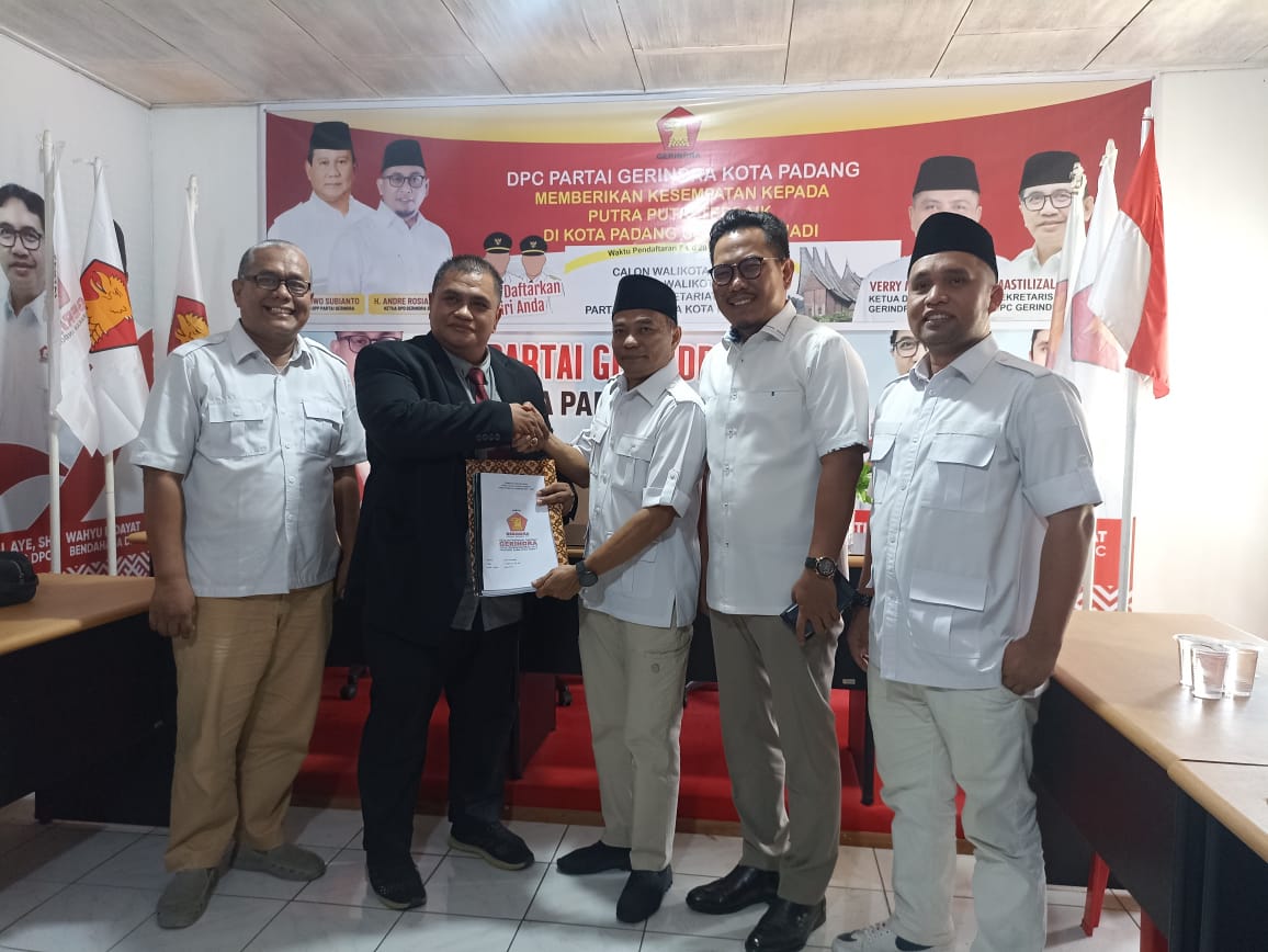 PADANG, HARIANHALUAN.ID – Anggota DPRD Provinsi Sumbar sekaligus kader Partai Gerindra, Hidayat, menyerahkan formulir berkas pendaftaran kepada Dewan Pimpinan Cabang (DPC) Partai Gerindra Kota Padang, Sabtu (11/5).