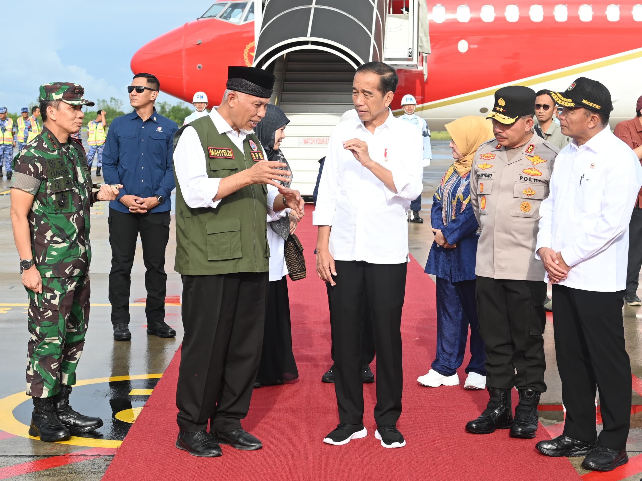 Tampak menyambut kedatangan Presiden dan Ibu Iriana yakni Gubernur Sumatera Barat Mahyeldi Ansharullah, Pangkogabwilhan I Laksdya TNI Agus Hariadi, Pangdam I/Bukit Barisan Mayjen TNI Mochammad