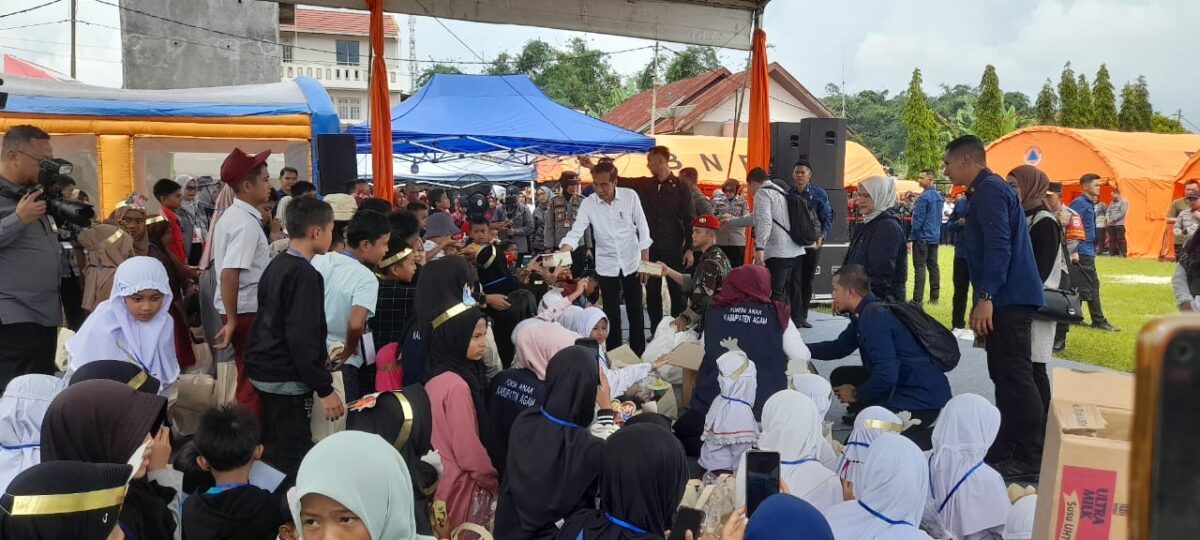 BUKITTINGGI, HARIANHALUAN.ID – Presiden RI Joko Widodo mengunjungi korban banjir bandang lahar dingin Gunung Marapi, di Bukit Batabuah, Selasa (21/5).
