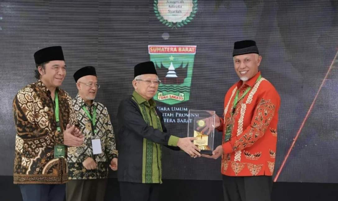 Penghargaan yang diberikan Komite Nasional Ekonomi Syariah (KNEKS) terhadap daerah yang dinilai paling berinisiatif dalam mengembangkan potensi ekonomi keuangan syariah itu, diserahkan Wakil Presiden RI, Ma’ruf Amin kepada Gubernur Mahyeldi Ansharullah di gedung Menara Syariah,Pantai Indah Kapuk 2, Tangerang Banten Senin (20/5) kemarin.