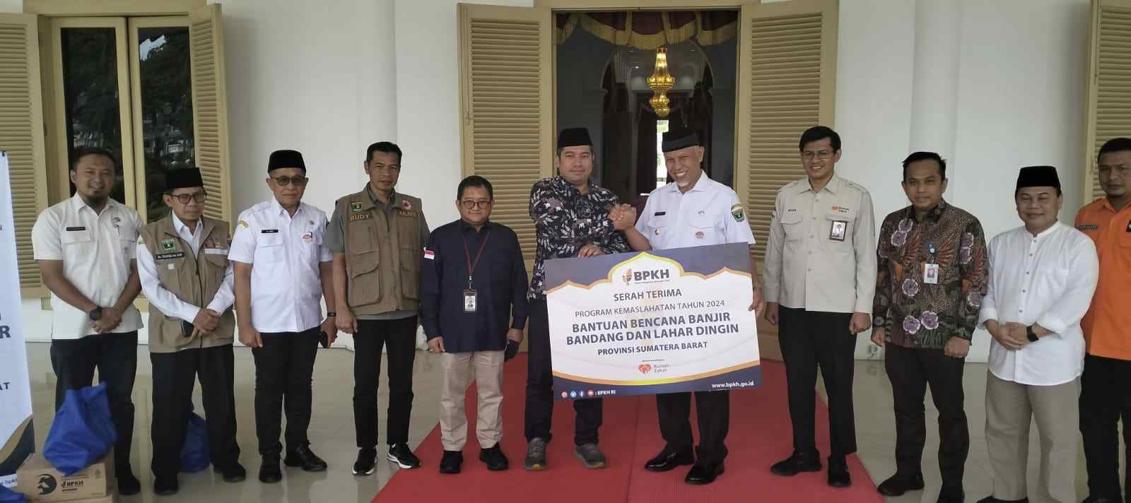 Anggota Badan Pelaksana BPKH Pusat, Harry Alexander, menyerahkan secara simbolis bantuan untuk korban banjir bandang di Padang Panjang, Agam dan Tanah Datar. Bantuan ini diterima langsung Gubernur Sumbar, Mahyeldi Ansharullah, di Istana Gubernuran Rabu (22/5/2024). ISRA