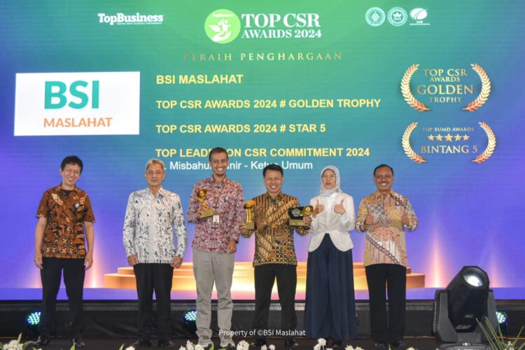 JAKARTA, HARIANHALUAN.ID — BSI Maslahat meraih tiga penghargaan yaitu Top Leader on CSR Commitment 2024, Golden Trophy, dan Top CSR 2024 bintang 5 pada TOP CSR Awards 2024 yang diselenggarakan oleh Majalah Top Business pada Rabu (29/5) di Hotel Raffles Jakarta.