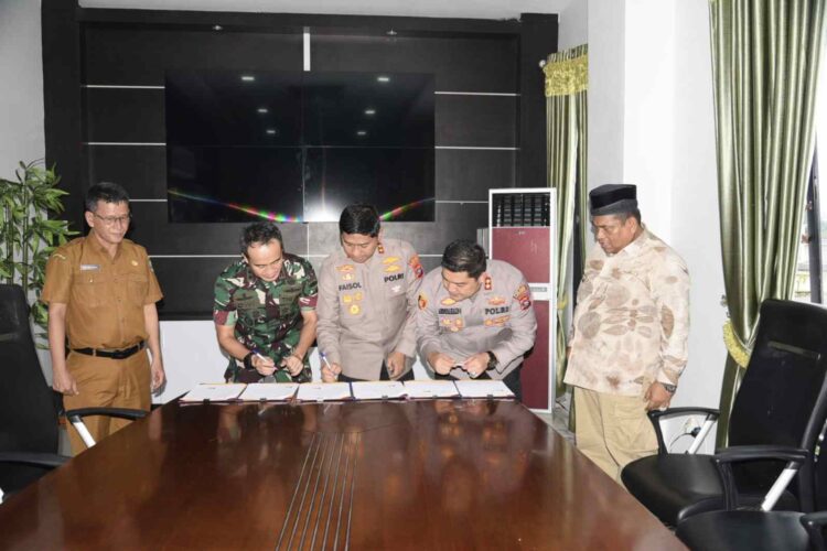 PADANG PARIAMAN, HARIANHALUAN.ID-Bupati Padang Pariaman Suhatri Bur bersama dengan Kapolres Padang Pariaman Ahmad Faisol Amir, Kapolres Pariaman Andreanaldo Ademi, dan Dandim 0308 Pariaman Wahyu Eko Purnomo menandatangani Naskah Perjanjian Dana Hibah (NPHD) Pengamanan Pilkada Tahun 2024, Selasa (4/6/24).